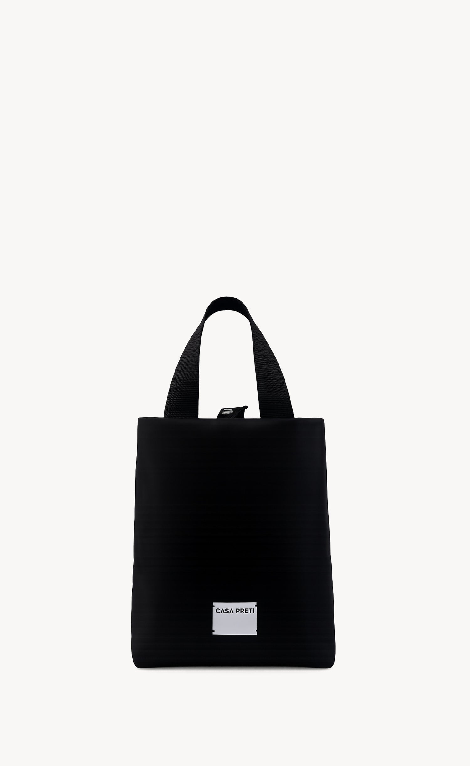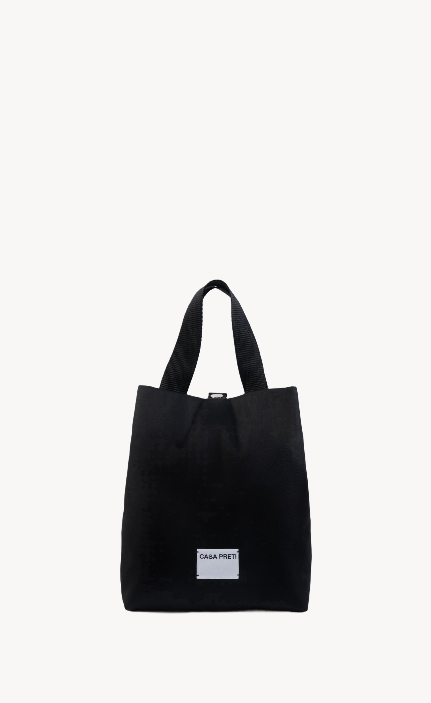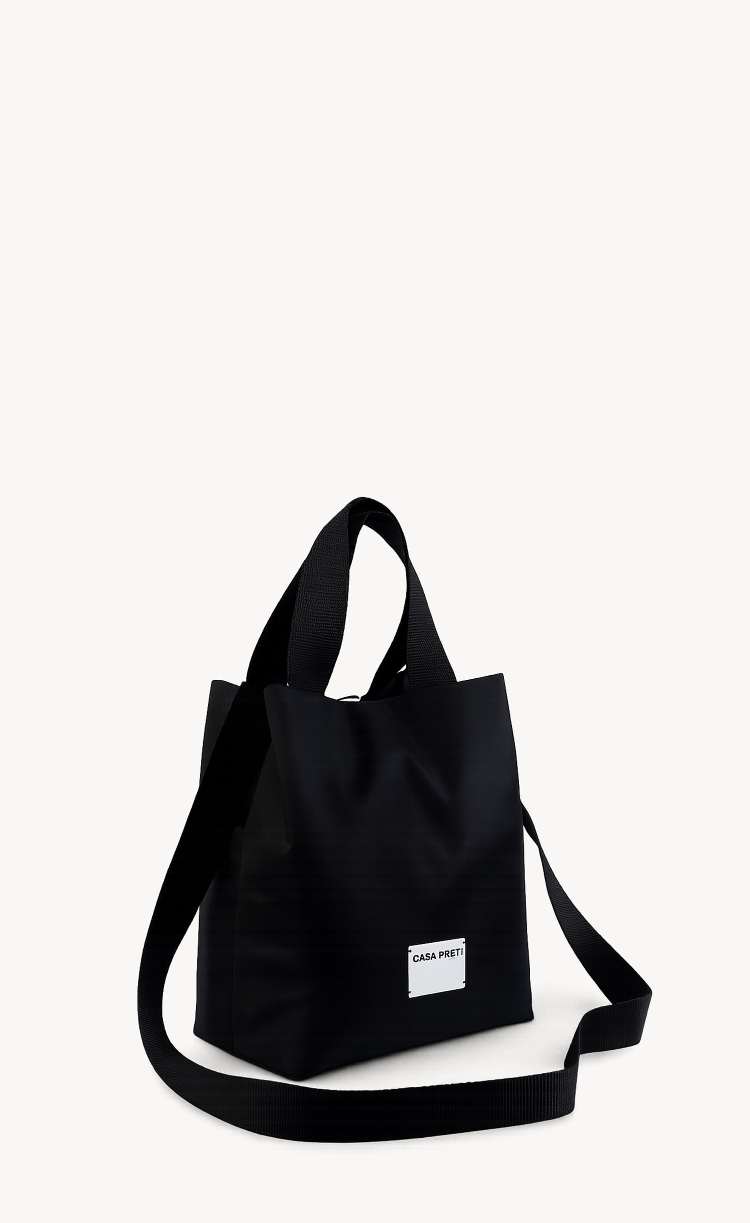 Borsa semirigida realizzata in nylon rigenerato ECONYL®, un filato ottenuto al 100% da materiali di recupero come reti da pesca dismesse e materiali tessili reimpiegati.