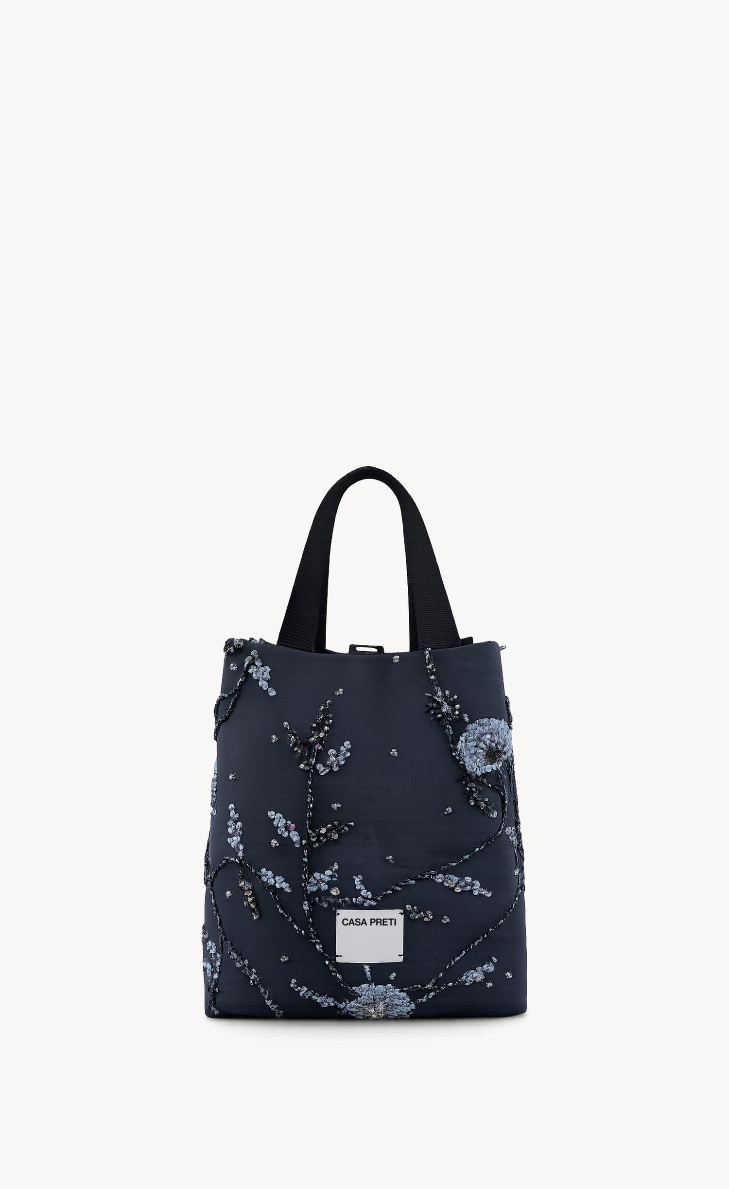 Questa borsa semirigida è realizzata in un tessuto prezioso proveniente dalla collezione “Ora” Autunno Inverno 2025–2026 di CASA PRETI, dove la seta dialoga con un ricamo meticoloso.